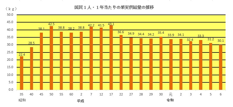 1人1年当たりに供給されているくだものの量は、30.1kg(令和6年度)で、令和に入って微減傾向となっています。くだものには、ビタミン、ミネラル、食物繊維等が豊富に含まれており、これらは私たちが健康を維持するうえでなくてはならない栄養素です。野菜と同様、毎日の食生活にくだものを定着させ、毎日200gのくだものを食べましょう。